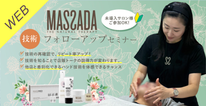 | 内容 | 導入サロンの皆さま、大変お待たせいたしました! 95%の体験者を感動させたMASSADAフェイシャルメソッド大公開セミナーを開催します。 先生方のサロンでは、ハンド技術による「結果出し」に自信を持てていますか? MASSADAのフェイシャルは、 “日本古来の技術” と “MASSADA独自のメソッド” を融合。 「まるでマシンのような満足度」と、全国のサロン様から驚きと高い評価をいただいております。 今回は、95%の体験者を感動させた手技の持ち主、沖 咲先生が講師をつとめ Okisaki式 MASSADAフェイシャルメソッドを余すことなく伝授いただきます。 ▼こんなサロン様にこそ、おすすめです ◯ MASSADA導入サロン様 → 自己流になっていませんか?技術の再確認で、リピート率アップへ! ◯ 店販のみ取り扱い中のサロン様 → 商品力を最大限に引き出す施術を知ることで、店販トークの説得力が変わります。 ◯ 導入を検討しているサロン様 → 「他店と差別化できるハンド技術」をライブ配信いたします。 当日は技術デモンストレーションを中心に進行しますが、 成分理論やクロージングトークなど、日々のサロンワークでの疑問もその場で解決いただけます。 機械に頼らず、 “自らの手で顧客を感動させる技術” を手に入れませんか? 皆さまのご参加を心よりお待ちしております。 ■セミナー技術講師 沖 咲 鍼美サロンEMAI オーナー 【国家資格】 あん摩マッサージ指圧師 はり師 きゅう師 医療リンパドレナージセラピスト 美容師免許 【資 格】 AEAインターナショナルエステティシャン 育児セラピスト ベビーマッサージインストラクター |