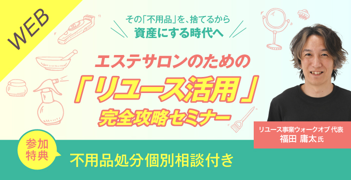 | 内容 | サロン経営において、買い替えで不要になった美容機器、旧型のタブレット、あるいは備品の数々。 また、自宅などでなんとなくしまってしまってどうしようもない不用品の数々。 「処分が面倒だから」と廃棄したり、「一括査定」や最寄りのリサイクルショップで安易に手放したりしていませんか? 実は、その判断こそが大きな経済的損失を招いています。 本セミナーは業界初、ビーユーのスタッフでありながらリユース事業を展開している講師より、個人・店舗レベルで実践できる「リユースのについて」を公開します。 ★本セミナーで学べる事★ ・リユース業界についての基本を学ぶことができます ・受講後から使える各プラットフォームの特徴や市場動向について学ぶことができます ・高額売却するための3つのポイント ・実際に売れている美容機器、什器3選ご紹介 ■ 講師プロフィール 福田 庸太(ふくた ようた) 美容業界歴17年 Bi-you運営責任者 ウォークオブ 代表(リユース事業) PC,、スマホ、タブレットなど小型家電特化した買取・販売店を経営。 美容とリユースを深く知る業界では数少ない存在としてリユース業界に貢献。 ★申込特典★ ・手数料無料!福田のリユースブレーンを活用した 最高値で不用品処分方法のアドバイス付(3点まで) 10サロンまで限定 |