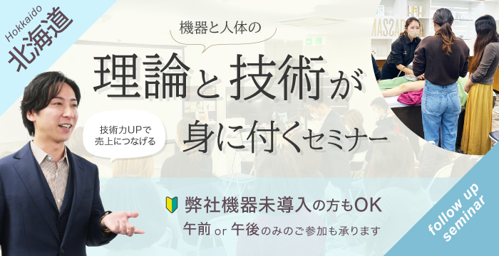 | 持ち物 | ・筆記具 ・施術練習を予定しておりますので、念の為メイク直しもご持参下さい。 ・お名刺(セミナー中に名札としてご使用いたしますのでご持参下さい。) |